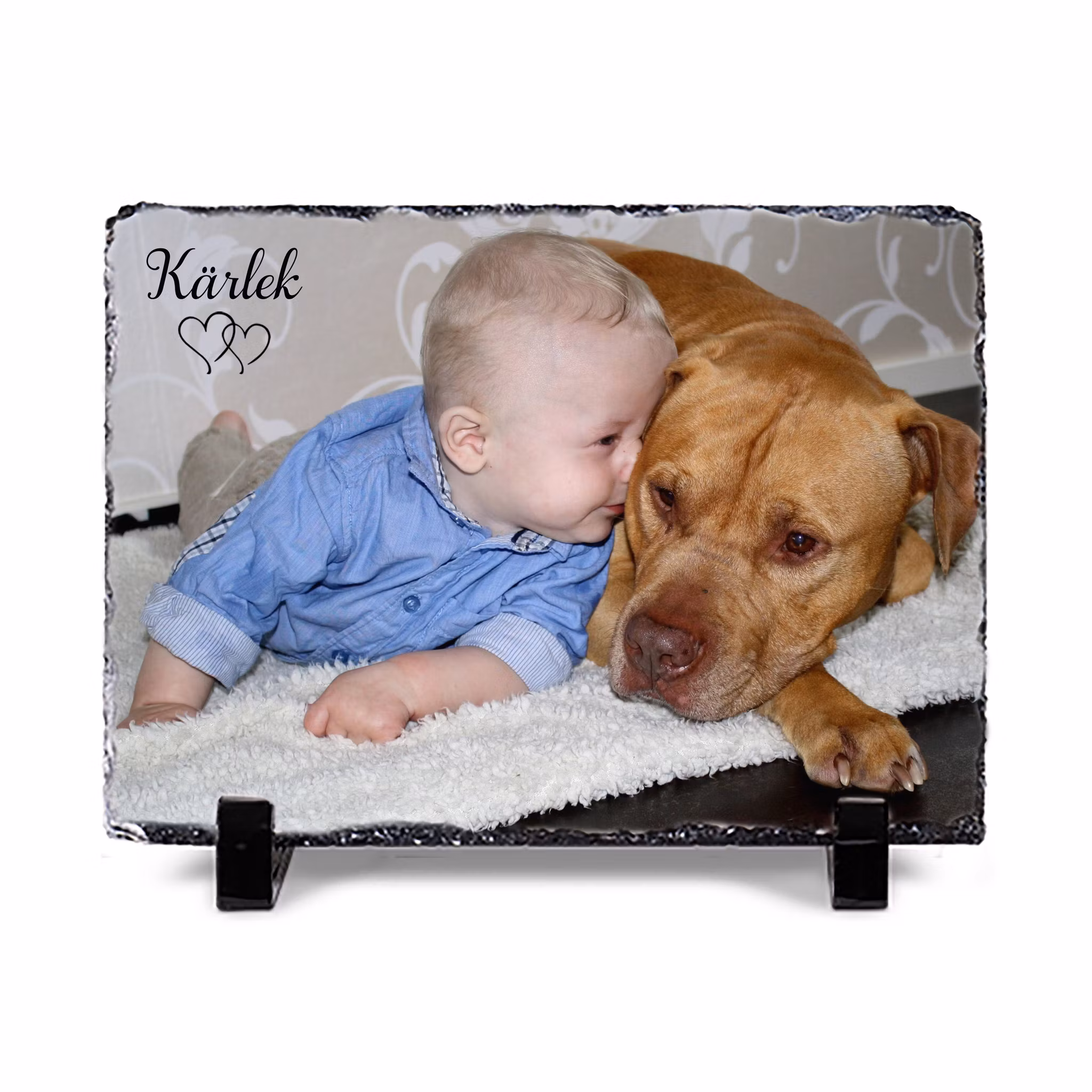 Stenplatta med er egen bild, och ett namn eller ord. Hjärtana hamnar automatiskt under namnet/ordet ni valt.