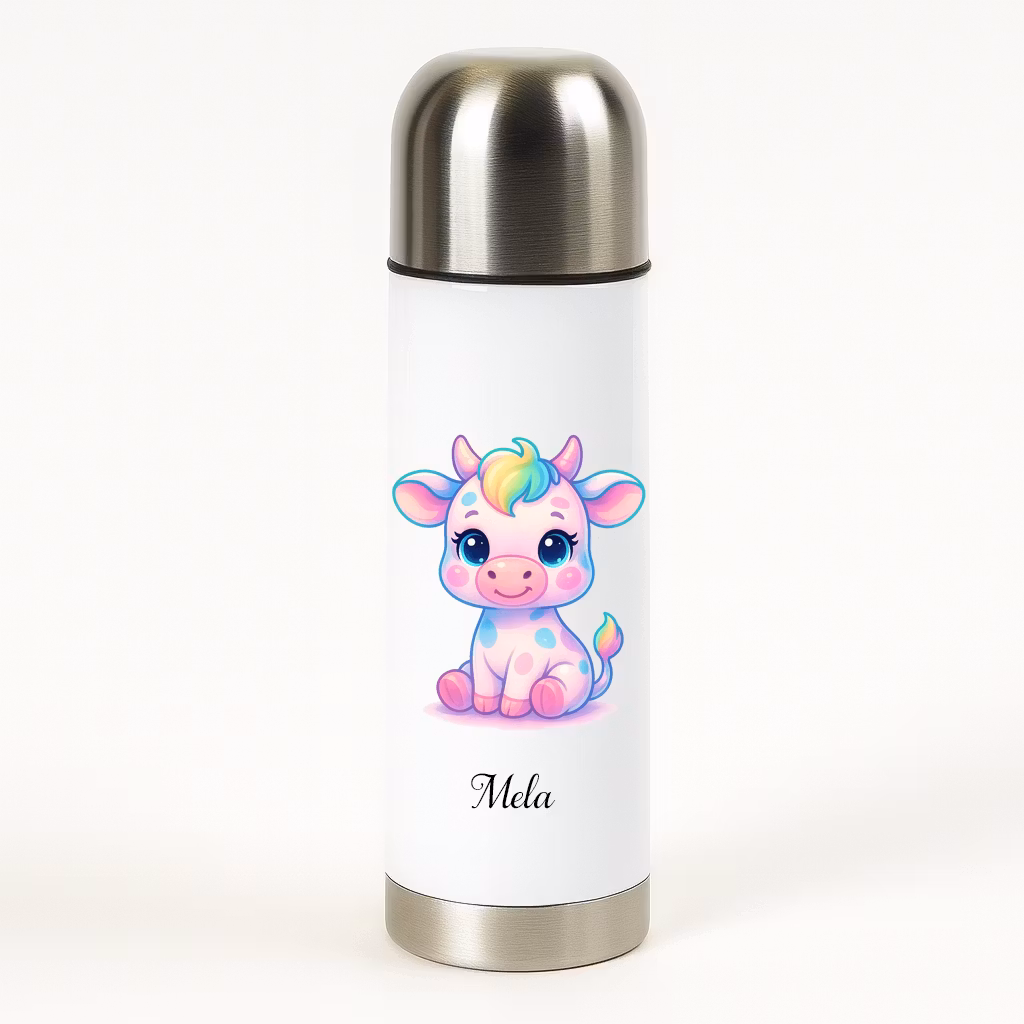 Personlig termos med olika färgglada djur och plats för valfritt namn – perfekt för skolstarten!