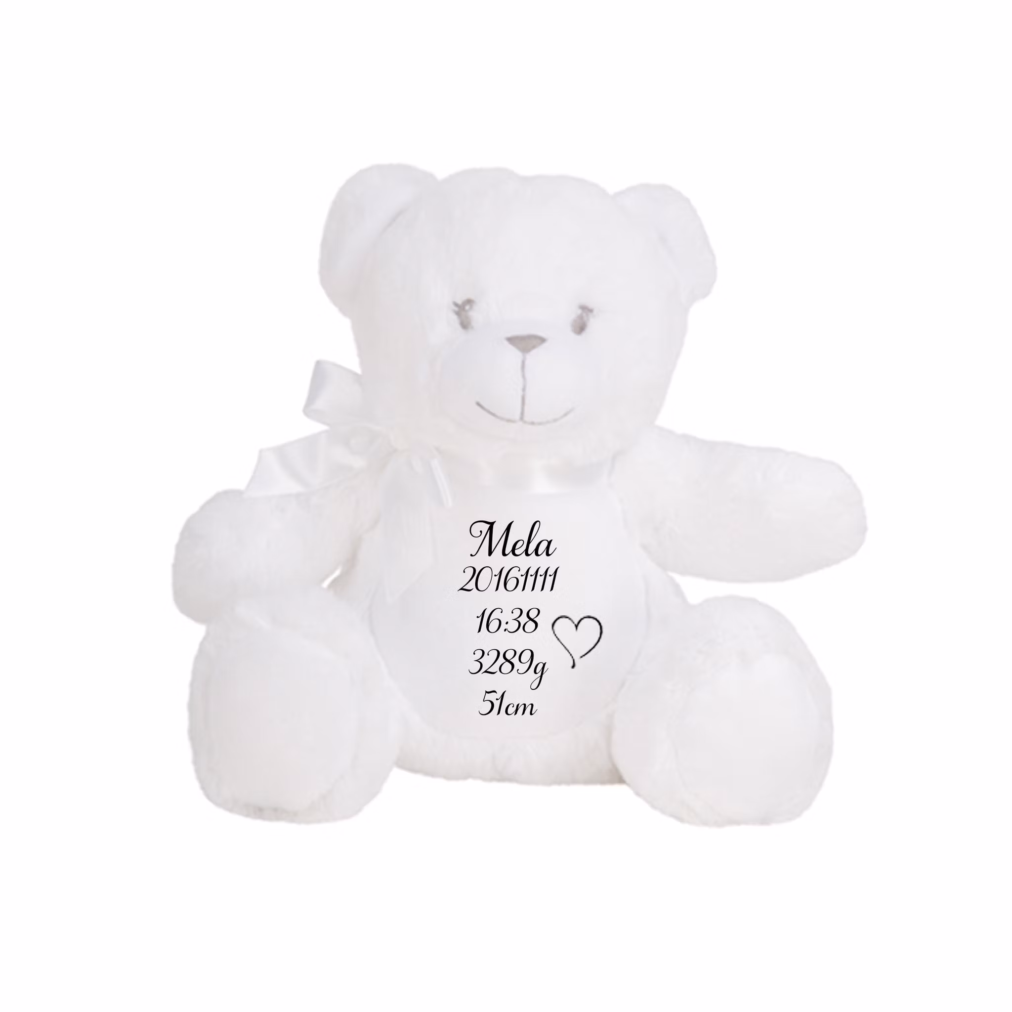 Nallen finns i färgerna vit, rosa, blå och regnbåge. Nallen är 30cm hög