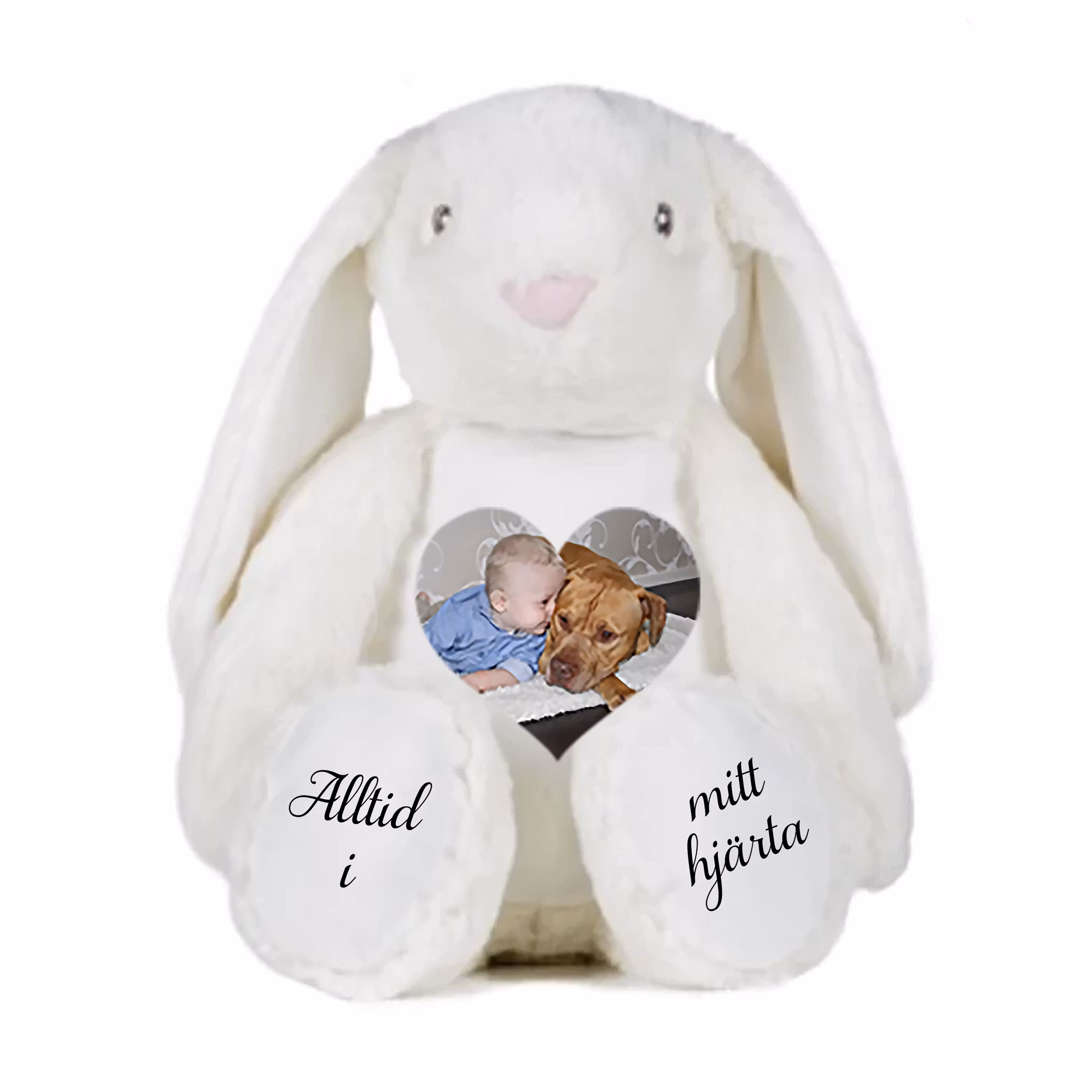 Ni väljer själv vilken text ni vill ha. Det går att placera text på insidan av öronen och på kaninens fötter.