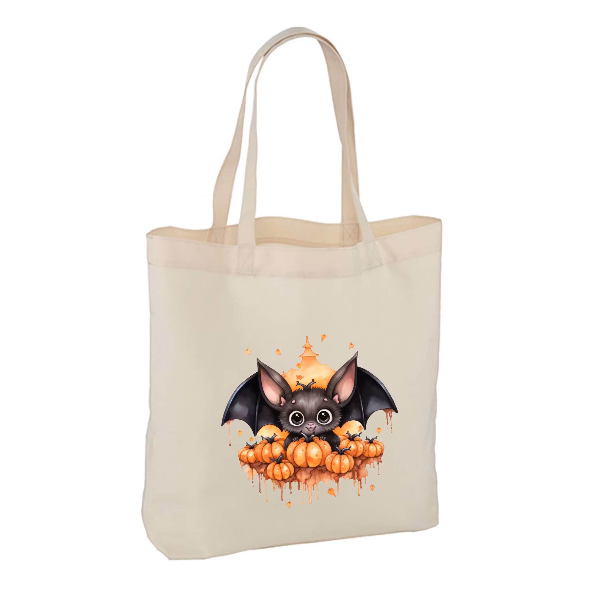 Stor och rymlig tygkasse med bred botten och halloweenmotiv.