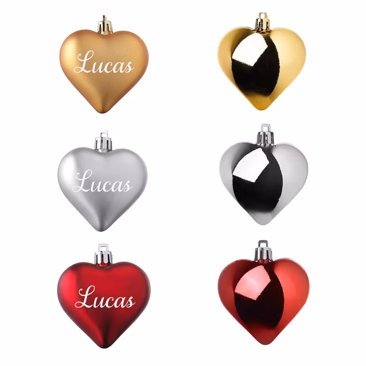 Personlig julgranskula i form av ett hjärta där ni väljer vilket namn eller ord ni vill ha.