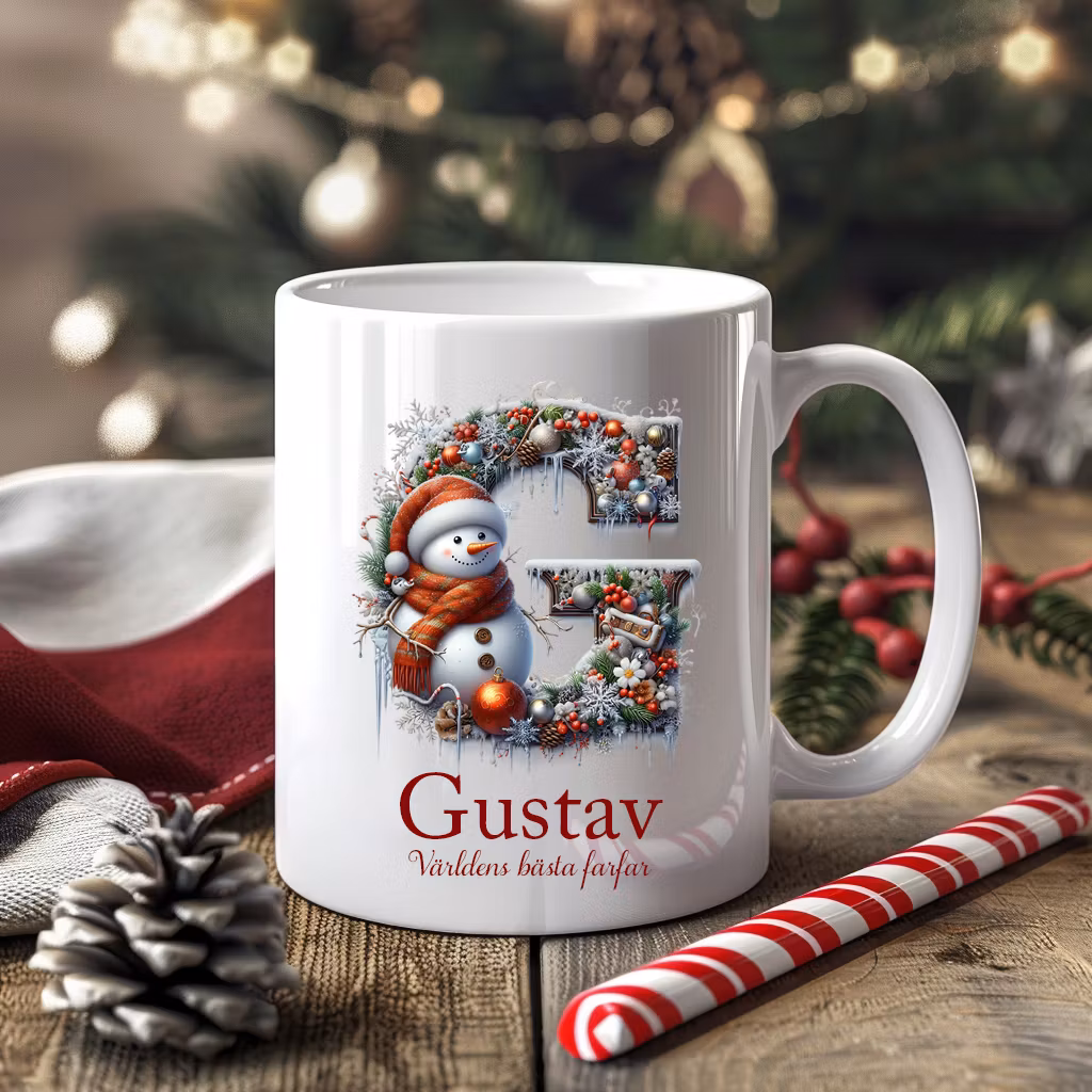 En fin personlig julmugg med stor bokstav och julpynt.