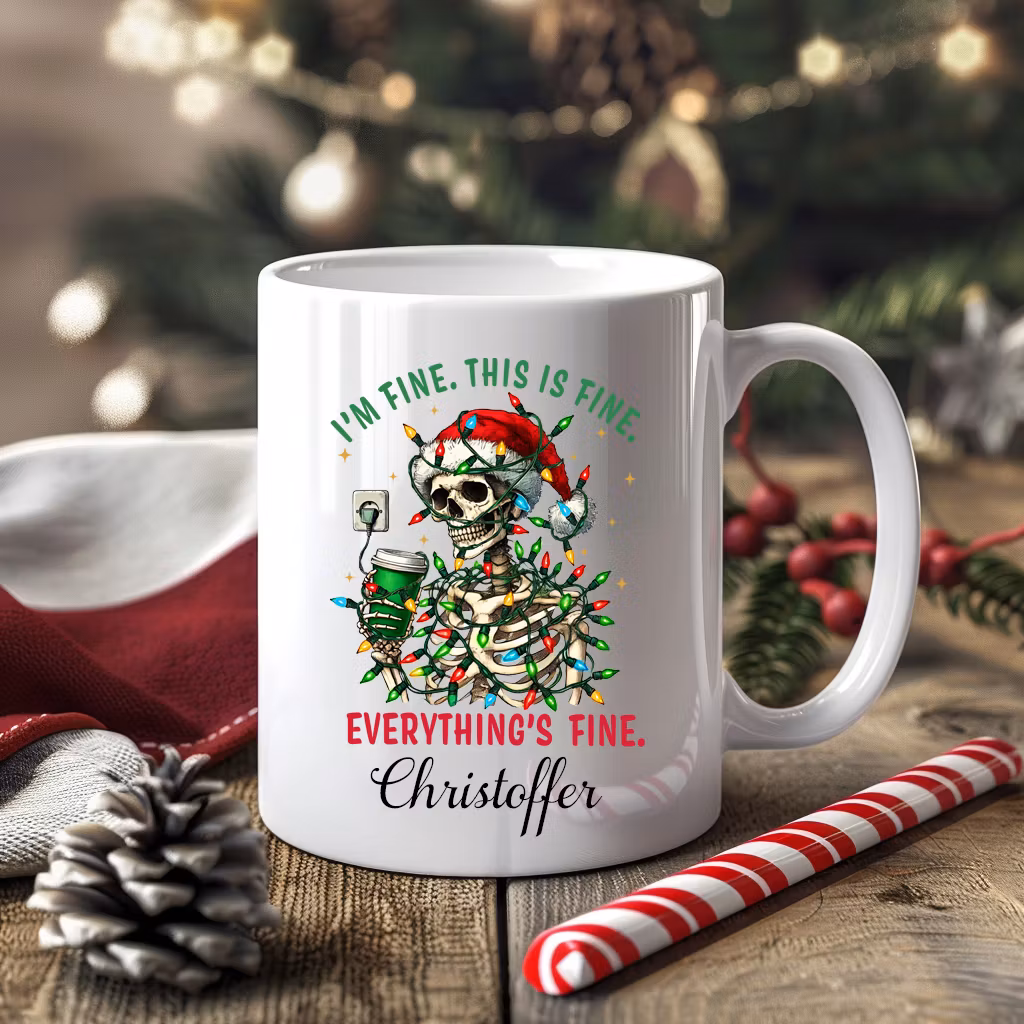 Ge din morgonkaffe eller te en dos humor och lite mörk julstämning med denna unika mugg. Med ett skelett intrasslat i en ljusslinga och en takeawaymugg i handen, samt den självironiska texten "I’m fine. This is fine. Everything’s fine.", är det här den perfekta muggen för den som ser det komiska i livets kaos. Dessutom kan du göra den ännu mer personlig genom att lägga till ditt eget namn under motivet!