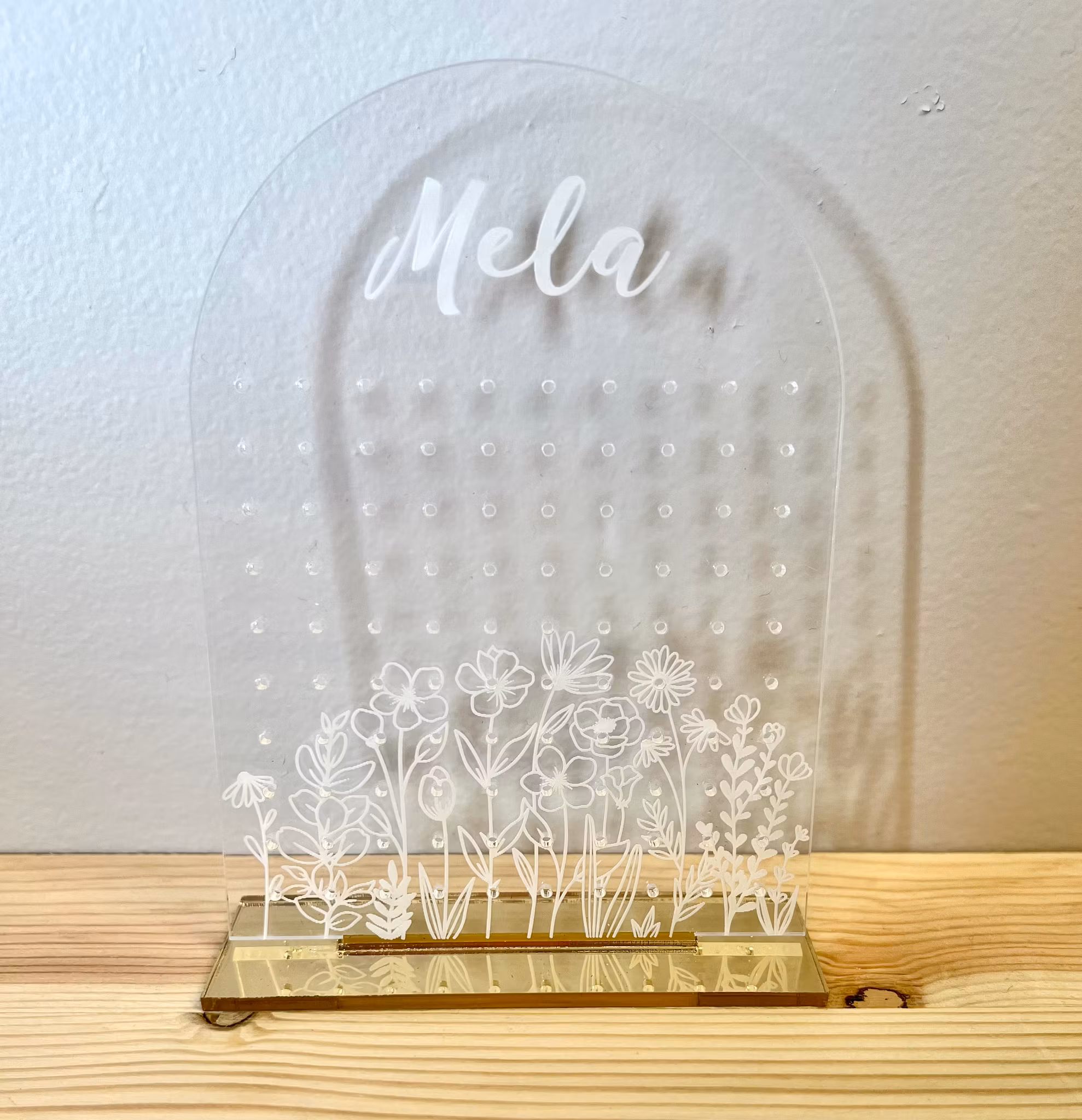 Ni väljer själv vilket namn som ska stå på och själva foten går att få i genomskinlig, vit, svart, svart glitter, silver glitter, guld glitter, rosa glitter, spegel guld, spegel silver, pärlemor ljusblå, pärlemor rosa eller pärlemor vit.