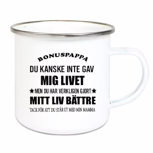 Gör emaljmuggen mer personlig genom att välja ett eget foto på andra sidan.