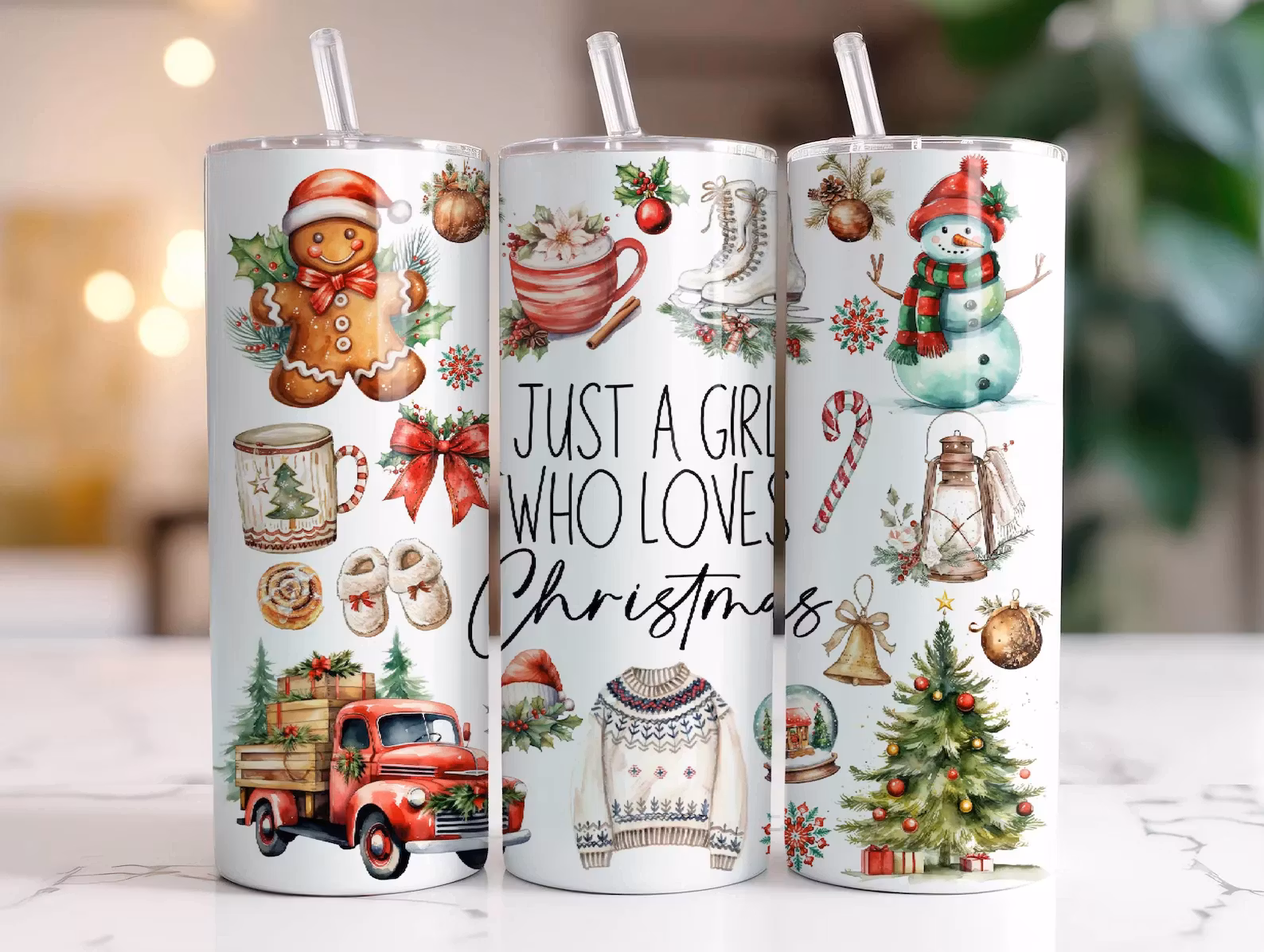 En mysig och charmig tumbler full av juldetaljer: pepparkakor, polkagrisar, glöggmugg, julgran, snögubbe, paket, varm choklad, stickad tröja och en röd jultruck. I mitten står texten “Just a girl who loves Christmas” – perfekt för alla som lever för julmys, pynt och decemberstämning.