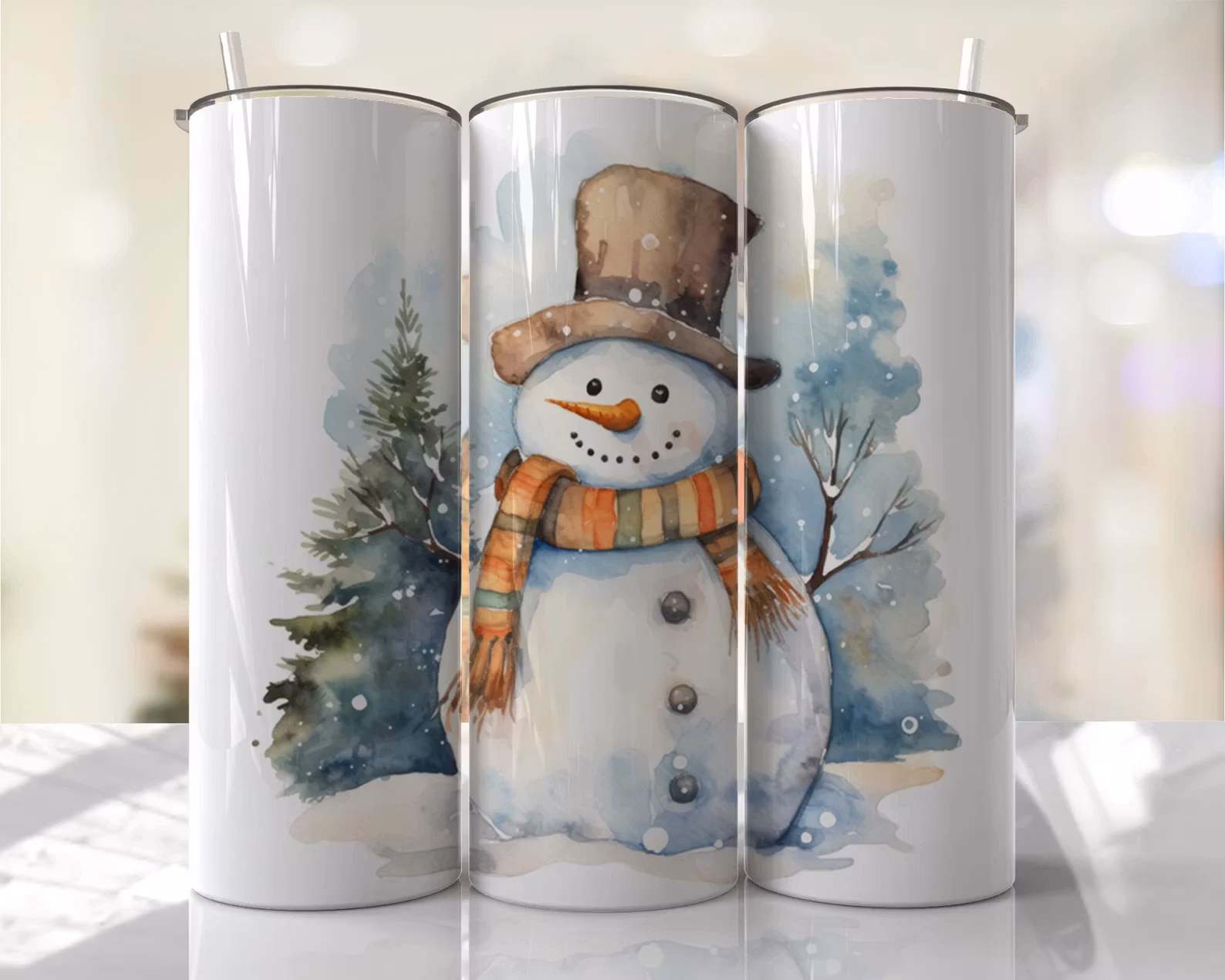 En söt och vintrig tumbler med en klassisk snögubbe i hatt och halsduk, omgiven av snötäckta träd och mjuka akvarellfärger. Motivet känns varmt, lugnt och perfekt för dig som älskar traditionell vinterkänsla och mysiga motiv.