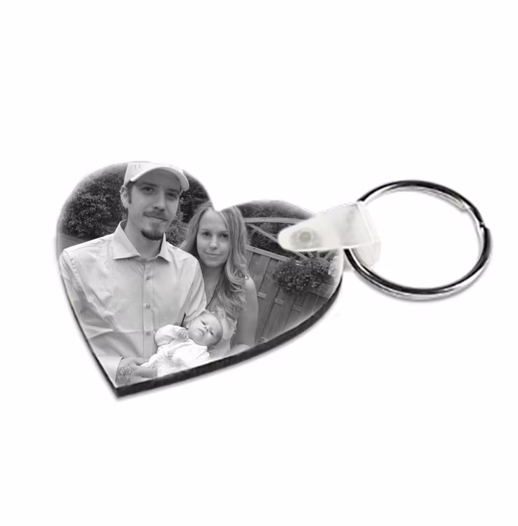 Nyckelring med eget foto på ena sidan och text på andra sidan.