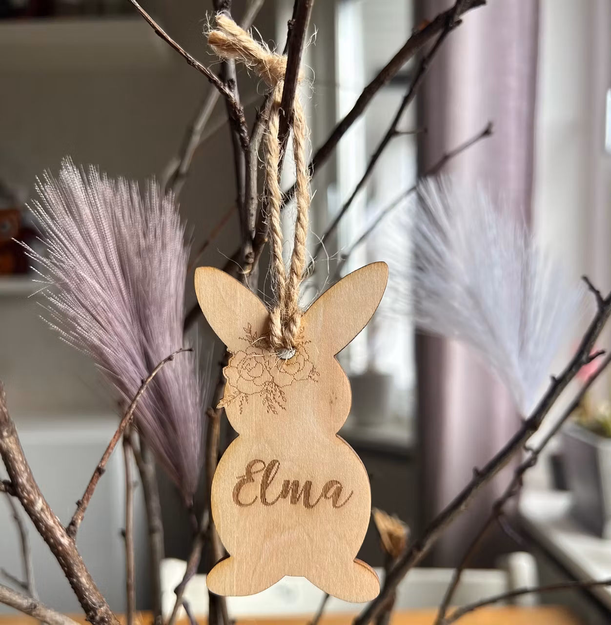 Gullig och personlig påskhare i 3mm tjockt trä eller olika färger av plexi, med ett valfritt namn.
