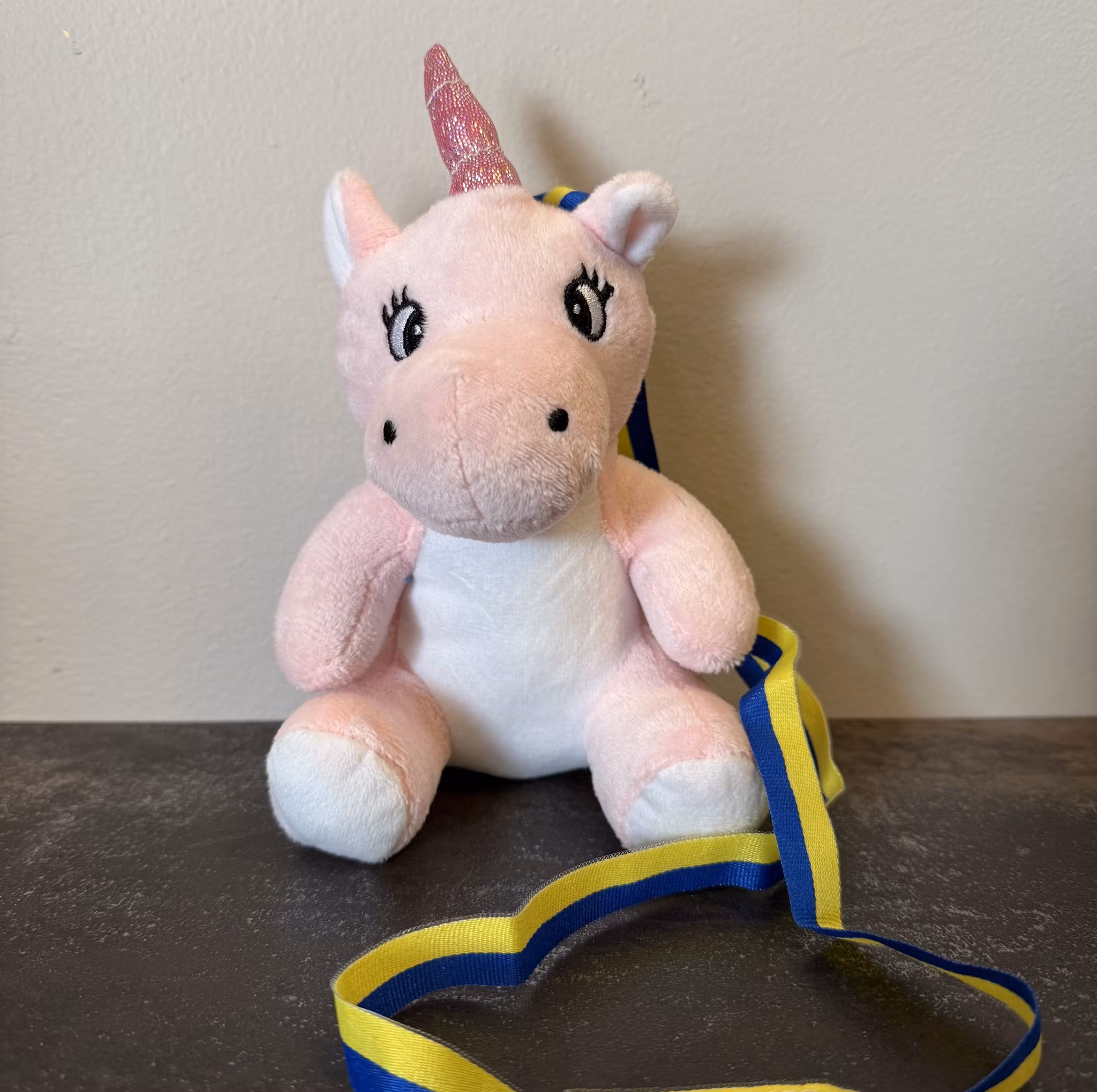 En jättegullig enhörning som levereras med ett blågult band så att den kan hängas runt halsen.