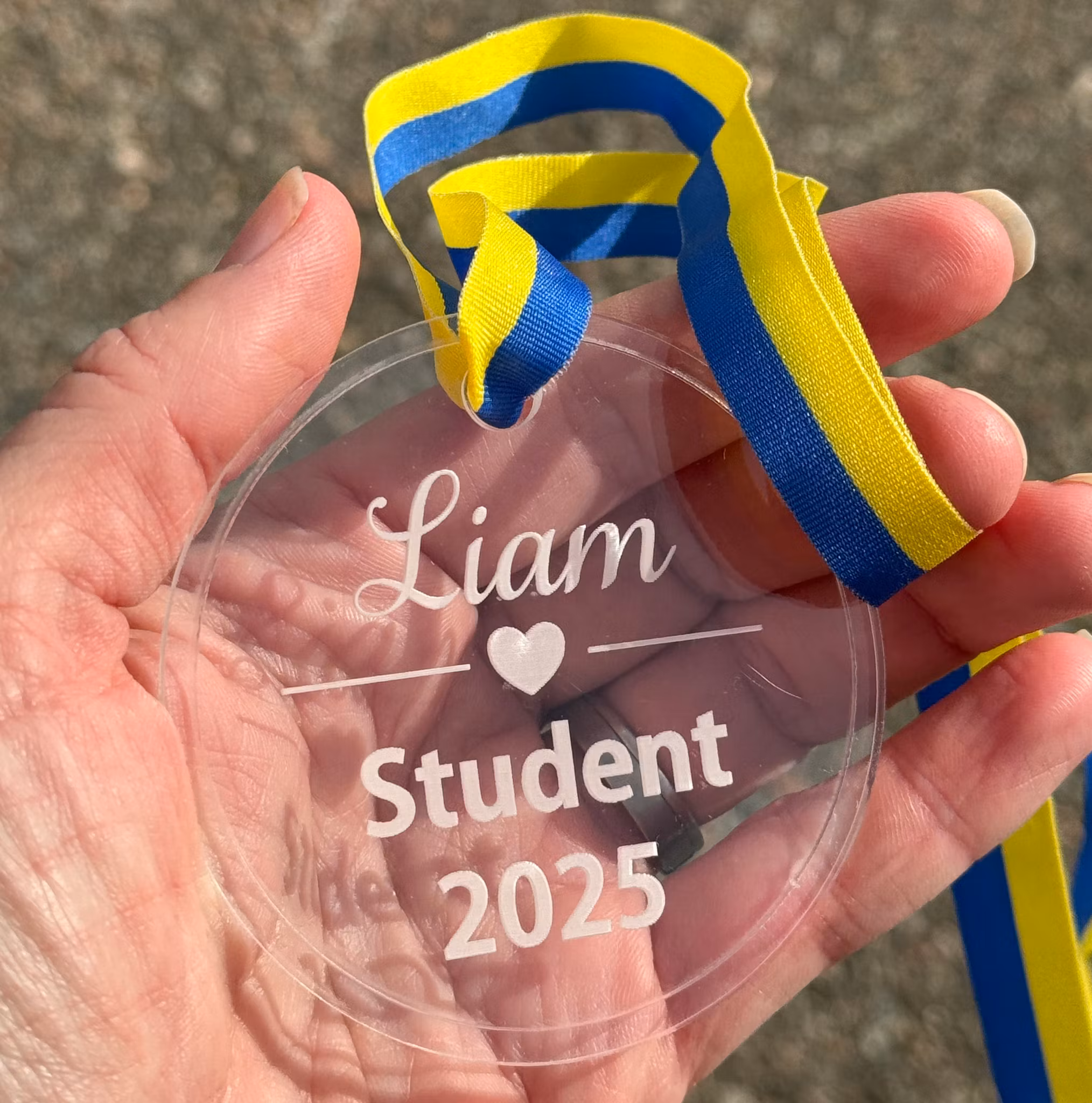 Medaljen levereras med ett blågult band så att den kan hängas kring studentens hals.